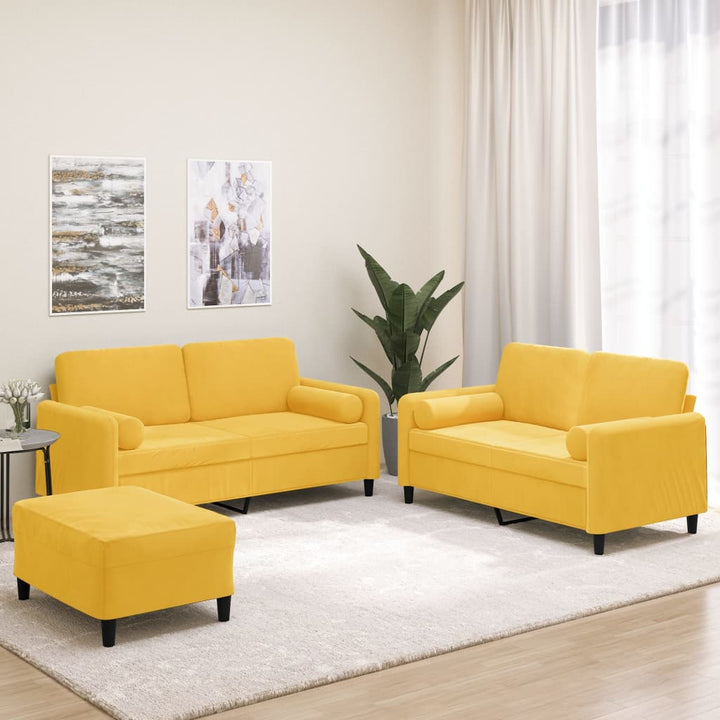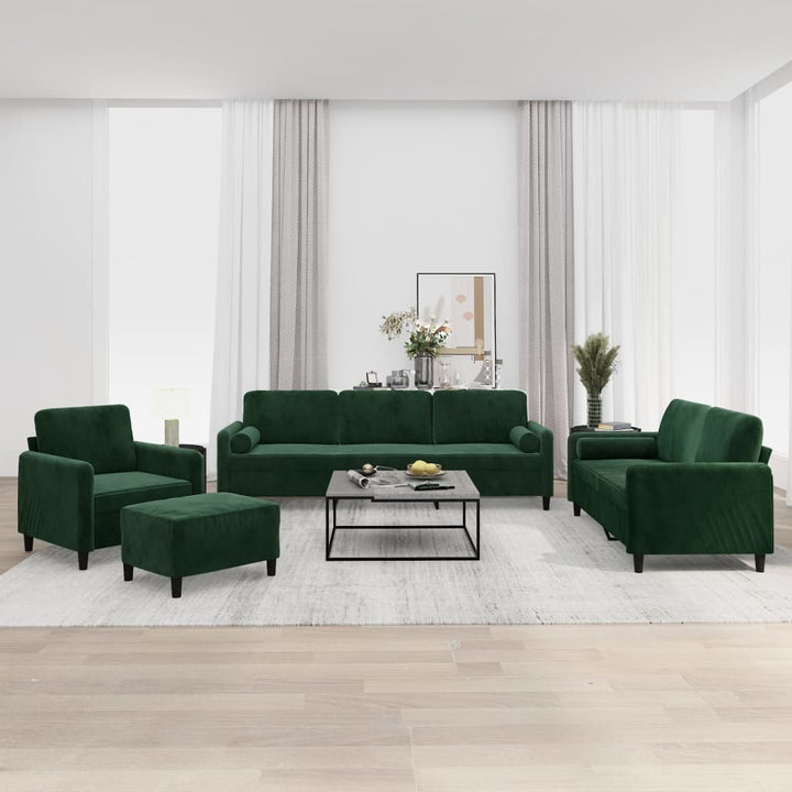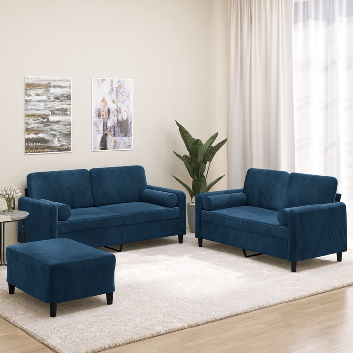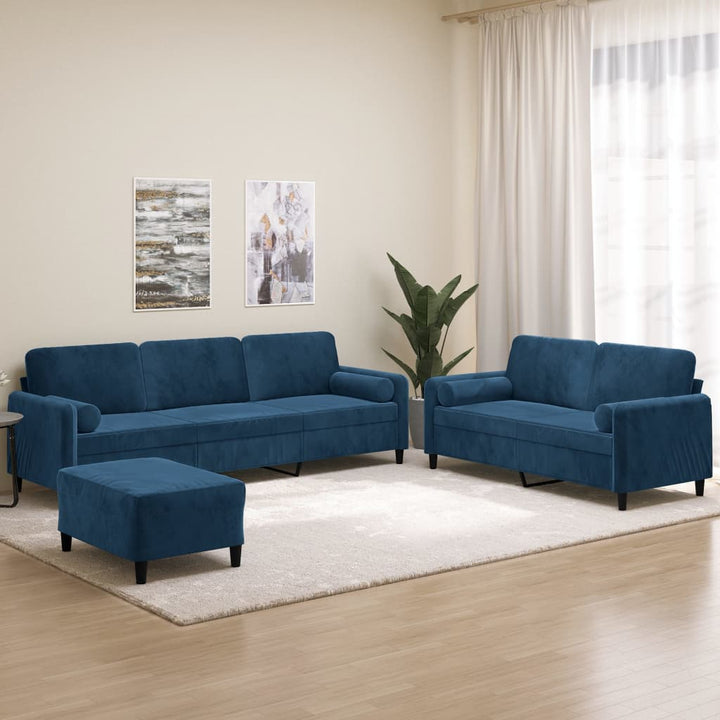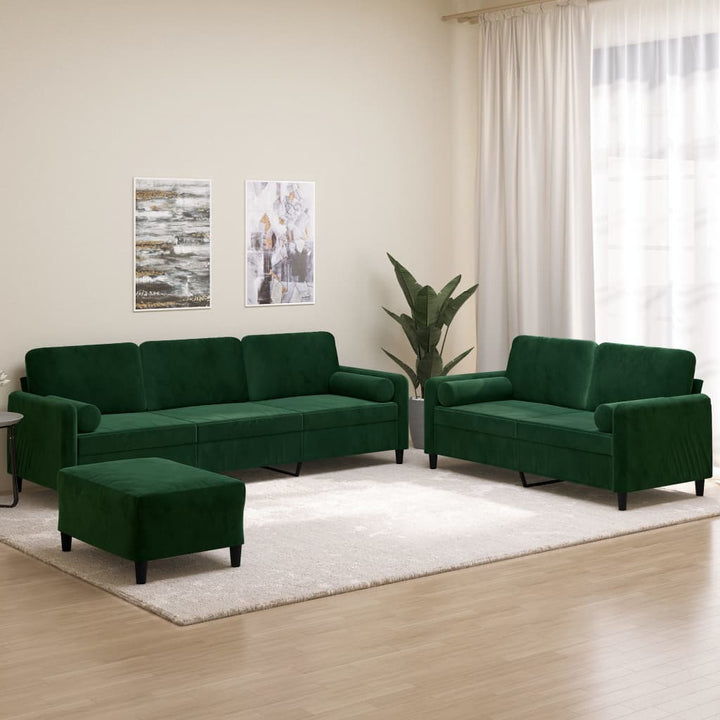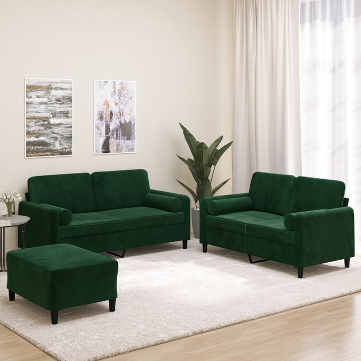 Diese Sofagarnitur bietet einen ausgezeichneten Platz zum Plaudern, Lesen, Fernsehen oder einfach nur zum Entspannen. Sie wird ein echter Blickfang in deinem Zuhause sein. Weicher Samt: Samt ist ein weicher, luxuriöser Stoff, der sich durch seinen dichten Flor aus gleichmäßig geschnittenen Fasern auszeichnet, die einen glatten Flor haben. Samt fühlt sich unverwechselbar weich an und ist angenehm zu berühren.Robuster und stabiler Rahmen: Der Rahmen aus Sperrholz und Metall verleiht dem Samtsofa Robustheit und Stabilität.Bequemes Sitzerlebnis: Mit dick gepolsterten Sitzflächen, Armlehnen und Rückenkissen versehen, ist das Sofa sehr bequem.Praktische Rollkissen: Diese Zylinderkissen werten nicht nur deine Einrichtung auf, sondern sorgen auch für zusätzlichen Komfort beim Sitzen oder Liegen.Vielseitiger Fußhocker: Der Hocker bietet Platz zum Ausruhen der Füße beim Liegen auf dem Sofa, kann aber auch als zusätzliche Sitzgelegenheit in deinem Zimmer dienen. Darüber hinaus eignet er sich durch sein schlichtes Design und seine kompakte Größe für fast alle Wohnräume. Hinweis:Jedes Produkt wird mit einer Montageanleitung in der Verpackung für eine einfache Montage geliefert.