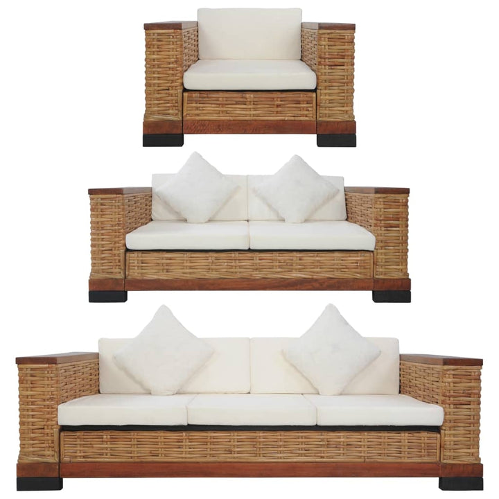Dieses Rattan-Sofa vereint Stil und Funktionalität und ist eine tolle Ergänzung für Ihr Zuhause! Dank des echten Rattan-Materials ist das Set leicht zu reinigen, strapazierfähig und für den täglichen Gebrauch bestens geeignet. Es verfügt über einen robusten Holzrahmen, der haltbar und sehr stabil ist. Die dicken Sitz- und Rückenpolster sind sehr bequem und dank ihrer abnehmbaren Bezüge sogar waschbar. Darüber hinaus tragen die breiten Armlehnen zu Ihrem Sitzkomfort bei. Die Lieferung umfasst einen Sessel, ein 3-Sitzer-Sofa, 4 Sitzpolster, 3 Rückenpolster und 2 Kissen.