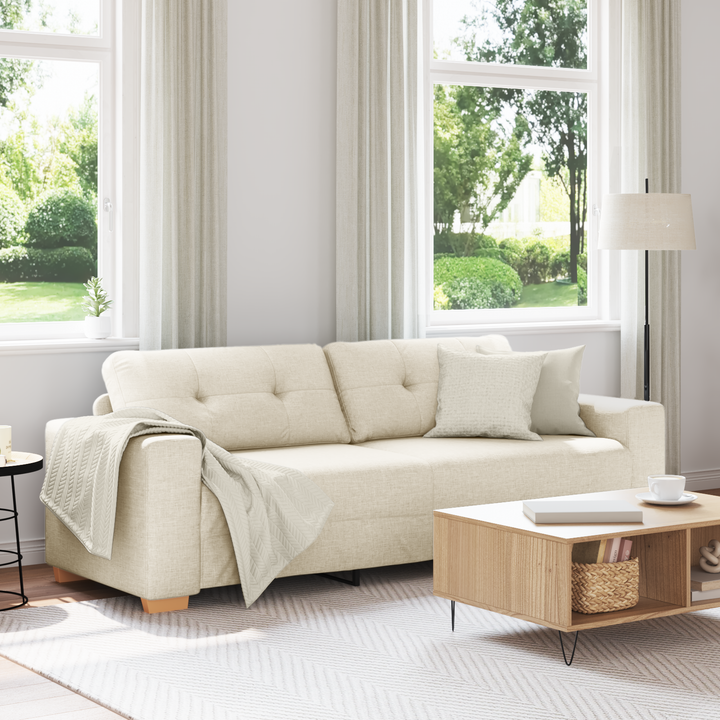 Erleben Sie außergewöhnlichen Komfort und Stil mit dem 3-Sitzer-Sofa, das sich perfekt zum Plaudern, Lesen, Fernsehen oder einfach zum Entspannen eignet. Natürliches und atmungsaktives Material: Leinen, ein natürliches Textil, das aus Flachsfasern gewonnen wird, bietet eine hervorragende Atmungsaktivität. Es absorbiert effektiv Feuchtigkeit und hilft bei der Temperaturregulierung, während seine natürliche Textur für einen stilvollen und gemütlichen Touch sorgt.Komfortables Sitzerlebnis: Dieses Relaxsofa ist mit dick gepolsterten Schaumstoffsitzen und fasergefüllten Kissen ausgestattet, die für eine hervorragende Unterstützung sorgen und den idealen Platz zum Entspannen bieten.Robustes und stabiles Gestell: Das Gestell aus Sperrholz und Metall und die stützenden Beine des Sofas sorgen für Stabilität, so dass Sie ein bequemes Sitzerlebnis genießen können, ohne sich um die Stabilität sorgen zu müssen.Vielseitig einsetzbar: Ob im Wohnzimmer, im Schlafzimmer, im Arbeitszimmer oder im Empfangsbereich, das moderne Sofa fügt sich mühelos in jede Umgebung ein. Von großzügigen Räumen bis hin zu intimen Ecken, sein flexibles Design sorgt dafür, dass es jeden Raum ohne Einschränkungen aufwertet.Aufsehen erregendes Design: Der Sessel zeichnet sich durch die Kombination von Leinen- und Sperrholzarmlehnen aus, die die Verschmelzung der verschiedenen Stilelemente unterstreicht und ihn sowohl an moderne als auch an traditionelle Innenräume anpasst.
